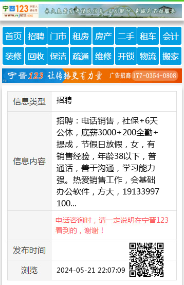 招聘:电话销售,社保+6天公休,底薪3000+200全勤+提成,节假日放假,女,有销售经验,年龄38以下,普通话,善于沟通,学习能力强。热爱销售工作,会基础办公软件,方大,19133997100