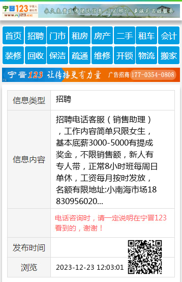 招聘电话客服(销售助理),工作内容简单只限女生,基本底薪3000-5000有提成奖金,不限销售额,新人有专人带,正常8小时班每周日单休,工资每月按时发放,名额有限地址:小南海市场18830956020 【电话咨询时,请一定说明在宁晋123看到的,谢谢!】 |