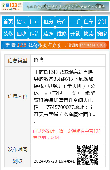 工商街杉杉男装现高薪直聘导购数名35周岁以下底薪加提成+早晚班(半天班)+公休三天+节假日三薪+工龄奖薪资待遇优厚晋升空间大电话:17745700027地址:宁晋天宝西街(老商厦对面) 【电话咨询时,请一定说明在宁晋123看到的,谢谢!】 |
