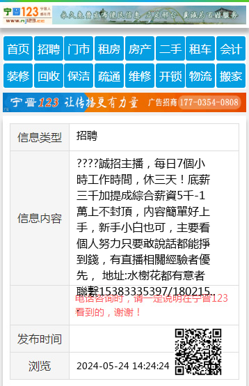????誠招主播,每日7個小時工作時間,休三天!底薪三千加提成綜合薪資5千-1萬上不封頂,內容簡單好上手,新手小白也可,主要看個人努力只要敢說話都能掙到錢,有直播相關經驗者優先, 地址:水榭花都有意者聯繫15383335397/18021517772 【电话咨询时,请一定说明在宁晋123看到的,谢谢!】 |