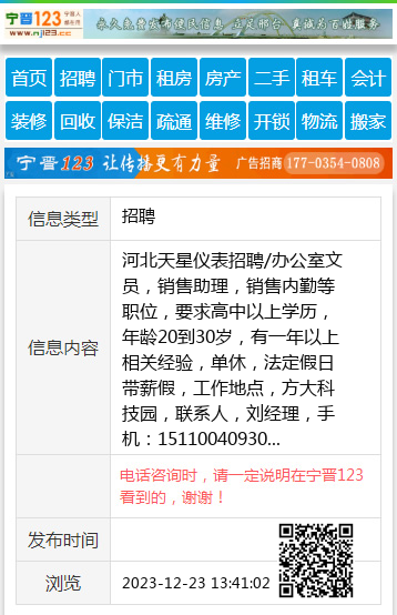 河北天星仪表招聘/办公室文员,销售助理,销售内勤等职位,要求高中以上学历,年龄20到30岁,有一年以上相关经验,单休,法定假日带薪假,工作地点,方大科技园,联系人,刘经理,手机:15110040930 【电话咨询时,请一定说明在宁晋123看到的,谢谢!】 |