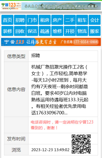 机械厂急招激光操作工2名(女士),工作轻松,简单易学-每天12小时2班到,每月大约有7天夜班--剩余时间都是白班。要求40岁以内对电脑熟练运用待遇每班133.3元起。有相关经验者优先录用电话17633096700 【电话咨询时,请一定说明在宁晋123看到的,谢谢!】 |