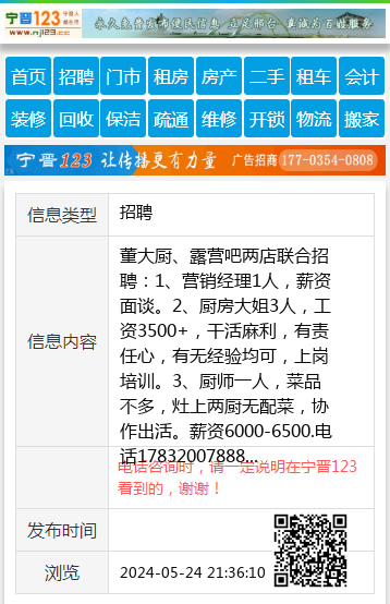 董大厨、露营吧两店联合招聘:1、营销经理1人,薪资面谈。2、厨房大姐3人,工资3500+,干活麻利,有责任心,有无经验均可,上岗培训。3、厨师一人,菜品不多,灶上两厨无配菜,协作出活。薪资6000-6500.电话17832007888 【电话咨询时,请一定说明在宁晋123看到的,谢谢!】 |