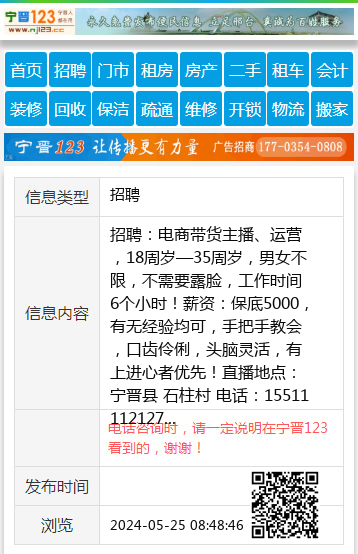 招聘:电商带货主播、运营,18周岁—35周岁,男女不限,不需要露脸,工作时间6个小时!薪资:保底5000,有无经验均可,手把手教会,口齿伶俐,头脑灵活,有上进心者优先!直播地点:宁晋县 石柱村 电话:15511112127 【电话咨询时,请一定说明在宁晋123看到的,谢谢!】 |