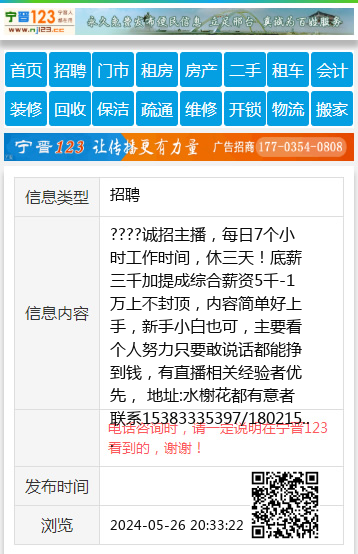 ????诚招主播,每日7个小时工作时间,休三天!底薪三千加提成综合薪资5千-1万上不封顶,内容简单好上手,新手小白也可,主要看个人努力只要敢说话都能挣到钱,有直播相关经验者优先, 地址:水榭花都有意者联系15383335397/18021517772 【电话咨询时,请一定说明在宁晋123看到的,谢谢!】 |