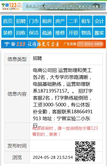 电商公司招 运营助理和美工各2名,大专学历思路清晰,电脑基础熟练,运营助理联系18713957157。。 招打字客服2名,打字熟练能倒班,工资3000-5000,有公休饭补全勤,客服联系18866491913 地址:宁晋实验二小东行 【电话咨询时,请一定说明在宁晋123看到的,谢谢!】 |