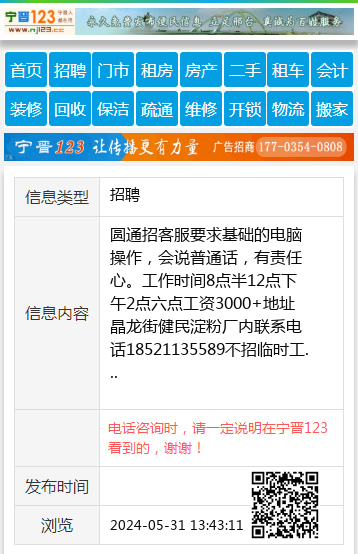 圆通招客服要求基础的电脑操作,会说普通话,有责任心。工作时间8点半12点下午2点六点工资3000+地址晶龙街健民淀粉厂内联系电话18521135589不招临时工 【电话咨询时,请一定说明在宁晋123看到的,谢谢!】 |