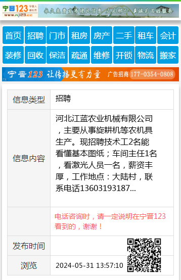 河北江蓝农业机械有限公司,主要从事旋耕机等农机具生产。现招聘技术工2名能看懂基本图纸;车间主任1名,看激光人员一名,薪资丰厚,工作地点:大陆村,联系电话13603193187 【电话咨询时,请一定说明在宁晋123看到的,谢谢!】 |