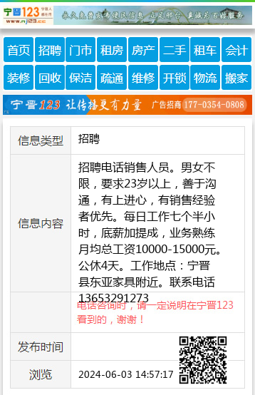 招聘电话销售人员。男女不限,要求23岁以上,善于沟通,有上进心,有销售经验者优先。每日工作七个半小时,底薪加提成,业务熟练月均总工资10000-15000元。公休4天。工作地点:宁晋县东亚家具附近。联系电话13653291273