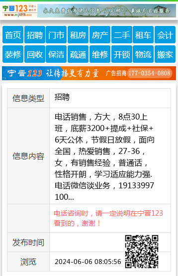 电话销售,方大,8点30上班,底薪3200+提成+社保+6天公休,节假日放假,面向全国,热爱销售,27-36,女,有销售经验,普通话,性格开朗,学习适应能力强.电话微信谈业务,19133997100 【电话咨询时,请一定说明在宁晋123看到的,谢谢!】 |