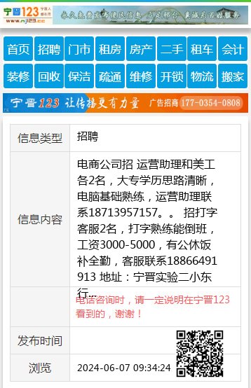 电商公司招 运营助理和美工各2名,大专学历思路清晰,电脑基础熟练,运营助理联系18713957157。。 招打字客服2名,打字熟练能倒班,工资3000-5000,有公休饭补全勤,客服联系18866491913 地址:宁晋实验二小东行