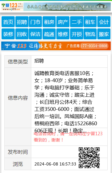诚聘教育类电话客服10名;女;18-40岁;业务简单易学;有电脑打字基础;乐于沟通;诚实守信;踏实上进;长白班月公休4天;综合工资3500-6000;面试通过后统一培训。凤城国际A座;梧桐府西邻;电话15226860606正规!长期!稳定 【电话咨询时,请一定说明在宁晋123看到的,谢谢!】 |