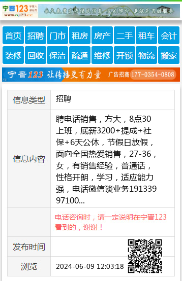 聘电话销售,方大,8点30上班,底薪3200+提成+社保+6天公休,节假日放假,面向全国热爱销售,27-36,女,有销售经验,普通话,性格开朗,学习,适应能力强,电话微信谈业务19133997100 【电话咨询时,请一定说明在宁晋123看到的,谢谢!】 |