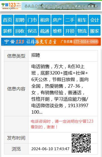电话销售,方大,8点30上班,底薪3200+提成+社保+6天公休,节假日放假,面向全国,热爱销售,27-36,女,有销售经验,普通话,性格开朗,学习适应能力强/电话微信谈业务,19133997100 【电话咨询时,请一定说明在宁晋123看到的,谢谢!】 |