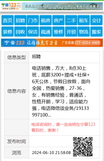 电话销售,方大,8点30上班,底薪3200+提成+社保+6天公休,节假日放假,面向全国,热爱销售,27-36,女,有销售经验,普通话,性格开朗,学习,适应能力强,电话微信谈业务/19133997100 【电话咨询时,请一定说明在宁晋123看到的,谢谢!】 |