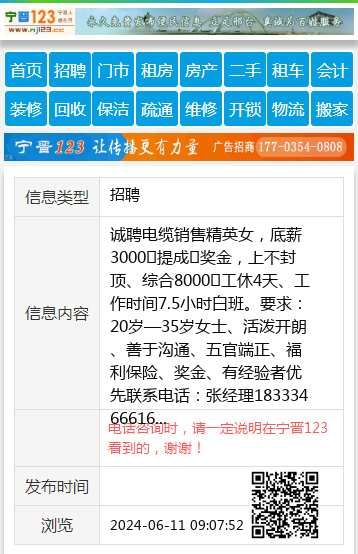 诚聘电缆销售精英女,底薪3000➕提成➕奖金,上不封顶、综合8000➕工休4天、工作时间7.5小时白班。要求:20岁—35岁女士、活泼开朗、善于沟通、五官端正、福利保险、奖金、有经验者优先联系电话:张经理18333466616 【电话咨询时,请一定说明在宁晋123看到的,谢谢!】 |