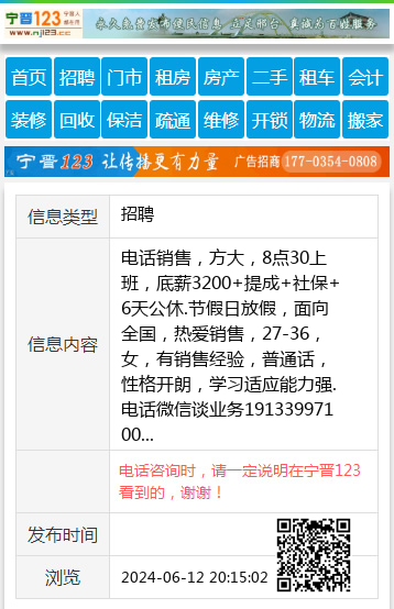 电话销售,方大,8点30上班,底薪3200+提成+社保+6天公休.节假日放假,面向全国,热爱销售,27-36,女,有销售经验,普通话,性格开朗,学习适应能力强.电话微信谈业务19133997100 【电话咨询时,请一定说明在宁晋123看到的,谢谢!】 |