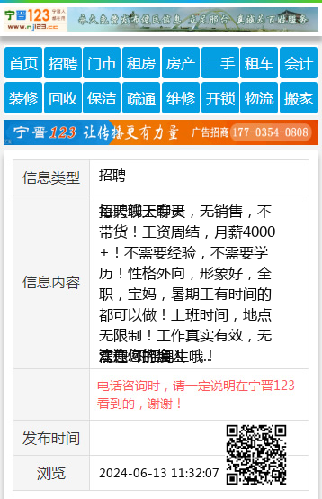 | 防骗提醒: | 宁晋123(www.nj123.cc)提醒您:手工活、网络兼职、刷单,都是骗子!凡以各种名义收取费用的都是骗子!找工作是往兜里挣钱,让你往外掏钱的都是骗子!异地招聘请提高警惕,谨防诈骗! |