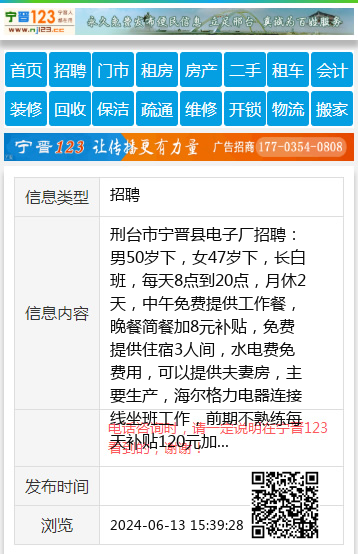 刑台市宁晋县电子厂招聘:男50岁下,女47岁下,长白班,每天8点到20点,月休2天,中午免费提供工作餐,晚餐简餐加8元补贴,免费提供住宿3人间,水电费免费用,可以提供夫妻房,主要生产,海尔格力电器连接线坐班工作,前期不熟练每天补贴120元加实际计件金额,后期熟练计件,每月工资5500元到6500元,(另辅助岗位招女50岁到60岁)(另包装车间招男50岁下计时制)坐满5天以上有工资,可以少量安排不认识字人员。可以预支。