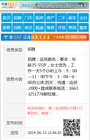 招聘:店员数名,要求:年龄35-55岁,女士优先,工作一天5个小时上午:9:00—11:00下午:3:00—6:00月公休:四天,待遇:店员:2000+提成联系电话:16633251778郭经理 【电话咨询时,请一定说明在宁晋123看到的,谢谢!】 |