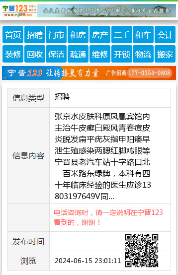 张京水皮肤科原凤凰宾馆内主治牛皮癣白殿风青春痘皮炎脱发扁平疣灰指甲阳痿早泄生殖感染两腮红脚鸡眼等宁晋县老汽车站十字路口北一百米路东绿牌,本科有四十年临床经验的医生应诊13803197649V同 【电话咨询时,请一定说明在宁晋123看到的,谢谢!】 |