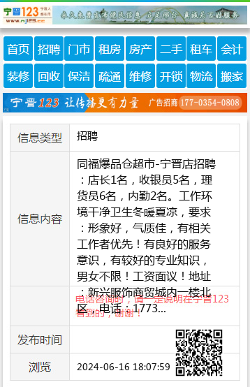 同福爆品仓超市-宁晋店招聘:店长1名,收银员5名,理货员6名,内勤2名。工作环境干净卫生冬暖夏凉,要求:形象好,气质佳,有相关工作者优先!有良好的服务意识,有较好的专业知识,男女不限!工资面议!地址:新兴服饰商贸城内一楼北区,电话:17733931258,15227739456 【电话咨询时,请一定说明在宁晋123看到的,谢谢!】 |