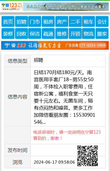 日结170月结180元/天。南宫医用手套厂18~男55女50周,不体检入职零费用,住宿新公寓,福利食堂一天只要十元左右。无菌车间,稍有点闷热和噪音。更多工作加微信看朋友圈:15530901546 【电话咨询时,请一定说明在宁晋123看到的,谢谢!】 |