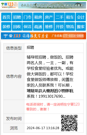 辅导班招聘,做饭的。招聘两名人员,一主,一副,有学校食堂经验者优先。或能做大锅饭的,都可以!学校食堂做饭师傅放假,闲置在家的人员联系我!可长期,可短期。大概7月10号开干。