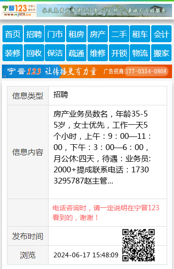 房产业务员数名,年龄35-55岁,女士优先,工作一天5个小时,上午:9:00—11:00,下午:3:00—6:00,月公休:四天,待遇:业务员:2000+提成联系电话:17303295787赵主管 【电话咨询时,请一定说明在宁晋123看到的,谢谢!】 |