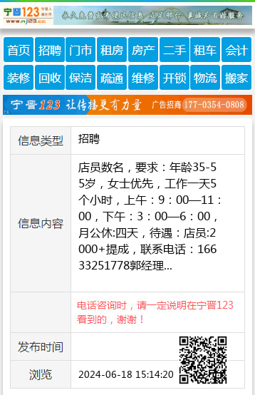 店员数名,要求:年龄35-55岁,女士优先,工作一天5个小时,上午:9:00—11:00,下午:3:00—6:00,月公休:四天,待遇:店员:2000+提成,联系电话:16633251778郭经理 【电话咨询时,请一定说明在宁晋123看到的,谢谢!】 |