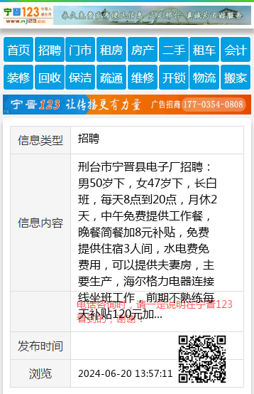 刑台市宁晋县电子厂招聘:男50岁下,女47岁下,长白班,每天8点到20点,月休2天,中午免费提供工作餐,晚餐简餐加8元补贴,免费提供住宿3人间,水电费免费用,可以提供夫妻房,主要生产,海尔格力电器连接线坐班工作,前期不熟练每天补贴120元加实际计件金额,后期熟练计件,每月工资5500元到6500元,(另辅助岗位招女50岁到60岁)(另包装车间招男50岁下计时制)坐满5天以上有工资,可以少量安排不认识字人员。可以预支。