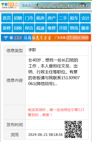 女40岁,想找一份长白班的工作,本人曾担任文员、出纳、行政主任等职位。有意的老板请与我联系15130907061(微信同号) 【电话咨询时,请一定说明在宁晋123看到的,谢谢!】 |