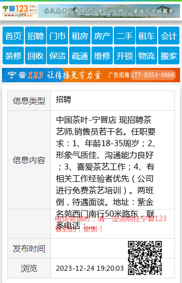 中国茶叶-宁晋店 现招聘茶艺师,销售员若干名。任职要求:1、年龄18-35周岁;2、形象气质佳、沟通能力良好;3、喜爱茶艺工作;4、有相关工作经验者优先(公司进行免费茶艺培训)。两班倒,待遇面谈。地址:紫金名苑西门南行50米路东,联系电话:武女士17731922258,赵先生13730484623 【电话咨询时,请一定说明在宁晋123看到的,谢谢!】 |