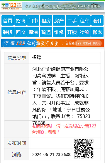 河北歪歪娃健康产业有限公司高薪诚聘:主播,网络运营,销售人员若干名,要求:年龄不限,底薪加提成,工资面议。我们期待你的加入,共同开创事业,成就非凡的你 !地址:宁晋世爵公馆门市,联系电话:17532378688 【电话咨询时,请一定说明在宁晋123看到的,谢谢!】 |