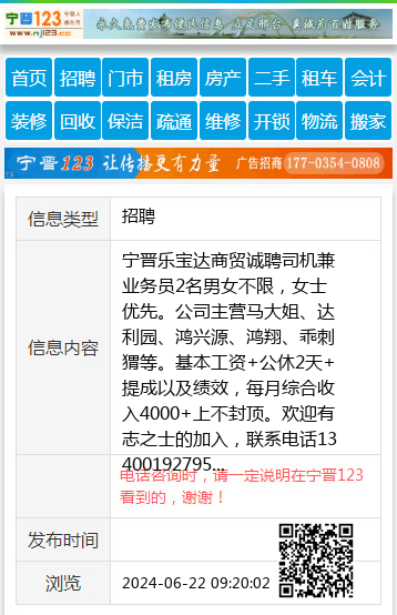 宁晋乐宝达商贸诚聘司机兼业务员2名男女不限,女士优先。公司主营马大姐、达利园、鸿兴源、鸿翔、乖刺猬等。基本工资+公休2天+提成以及绩效,每月综合收入4000+上不封顶。欢迎有志之士的加入,联系电话13400192795 【电话咨询时,请一定说明在宁晋123看到的,谢谢!】 |