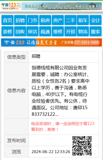 恒德线缆有限公司因业务发展需要,诚聘:办公室统计、质检(女性各2名)要求高中以上学历,善于沟通,熟悉电脑,40岁以下。有电缆行业经验者优先。有公休,待遇面议。公司地址:唐邱15833732122 【电话咨询时,请一定说明在宁晋123看到的,谢谢!】 |