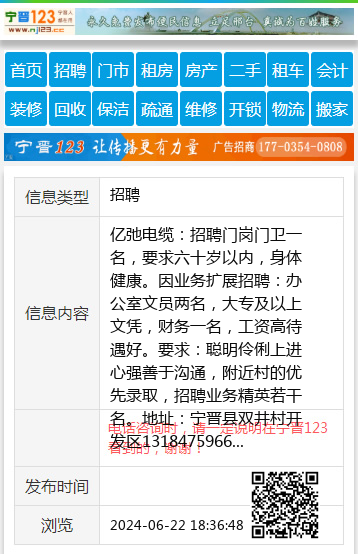亿弛电缆:招聘门岗门卫一名,要求六十岁以内,身体健康。因业务扩展招聘:办公室文员两名,大专及以上文凭,财务一名,工资高待遇好。要求:聪明伶俐上进心强善于沟通,附近村的优先录取,招聘业务精英若干名。地址:宁晋县双井村开发区13184759666