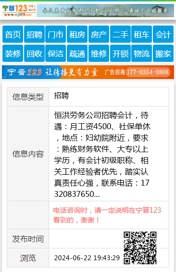 恒洪劳务公司招聘会计,待遇:月工资4500、社保单休,地点:妇幼院附近,要求:熟练财务软件、大专以上学历,有会计初级职称、相关工作经验者优先,踏实认真责任心强,联系电话:17320837650 【电话咨询时,请一定说明在宁晋123看到的,谢谢!】 |