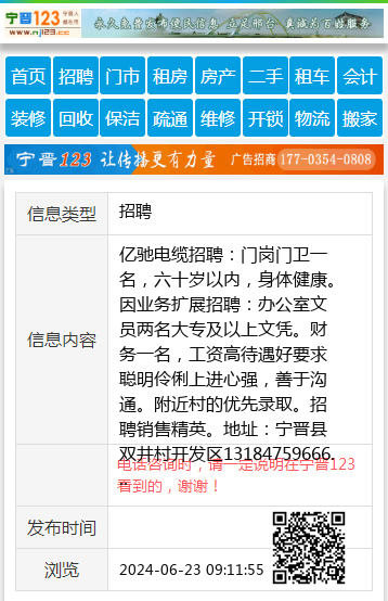 亿驰电缆招聘:门岗门卫一名,六十岁以内,身体健康。因业务扩展招聘:办公室文员两名大专及以上文凭。财务一名,工资高待遇好要求聪明伶俐上进心强,善于沟通。附近村的优先录取。招聘销售精英。地址:宁晋县双井村开发区13184759666 【电话咨询时,请一定说明在宁晋123看到的,谢谢!】 |