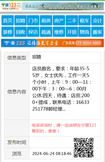 店员数名,要求:年龄35-55岁,女士优先,工作一天5个小时,上午:9:00—11:00下午:3:00—6:00月公休:四天,待遇:店员:2000+提成,联系电话:16633251778郭经理 【电话咨询时,请一定说明在宁晋123看到的,谢谢!】 |