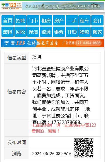 河北歪歪娃健康产业有限公司高薪诚聘,主播不坐班五个小时,网络运营,销售人员若干名,要求:年龄不限,底薪加提成,工资面议。我们期待你的加入,共同开创事业,成就非凡的你 !地址:宁晋世爵公馆门市,联系电话:17532378688 【电话咨询时,请一定说明在宁晋123看到的,谢谢!】 |