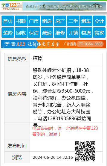 移动外呼对外扩招,18-38周岁,业务稳定简单易学,长白班,8小时工作制,社保,综合薪资3500-6000元,福利待遇好,办公氛围佳,晋升机制完善,新人入职奖励等,办公地址方大科技园,电话13831935896微信同号 【电话咨询时,请一定说明在宁晋123看到的,谢谢!】 |