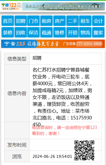 名仁苏打水招聘宁晋县城餐饮业务,开电动三轮车,底薪4000元,常白班公休4天,加提成每箱2元,加绩效,男女不限,走访饭店以及特通渠道,理货䣃货,吃苦耐劳,有责任心。地址:菜市场北口路北,电话:15175930450 【电话咨询时,请一定说明在宁晋123看到的,谢谢!】 |
