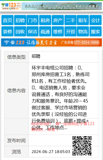 环宇丰电缆公司招聘:❶、郑州库房招普工1名,熟练司机1名,有工作经验者优先。❷、电话销售人员,要求会说普通话,有良好的沟通能力和服务意识。年龄20~45做过客服、学过市场营销的优先录取(没经验的公司进行免费培训)。底薪+提成+公休。工作地点:天一广场附近,联系电话 13131939710 【电话咨询时,请一定说明在宁晋123看到的,谢谢!】 |