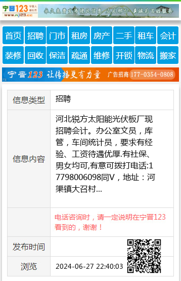 河北锐方太阳能光伏板厂现招聘会计。办公室文员,库管,车间统计员,要求有经验、工资待遇优厚.有社保、男女均可,有意可拨打电话:17798006098同V,地址:河渠镇大召村 【电话咨询时,请一定说明在宁晋123看到的,谢谢!】 |
