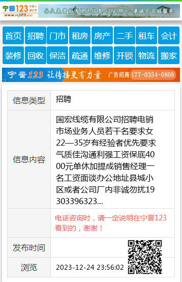 国宏线缆有限公司招聘电销市场业务人员若干名要求女22—35岁有经验者优先要求气质佳沟通利强工资保底4000元单休加提成销售经理一名工资面谈办公地址县城小区或者公司厂内非诚勿扰19303396323 【电话咨询时,请一定说明在宁晋123看到的,谢谢!】 |