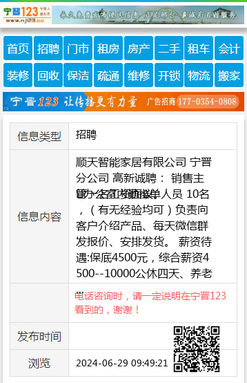 顺天智能家居有限公司 宁晋分公司 高新诚聘: 销售主管一名工资面议。