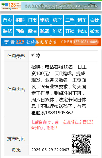 招聘:电话客服10名,日工资100元/一天➕提成。提成现发。业务员数名,工资面议,没有业绩要求,每天固定工作量,到点准时下班,周六日双休,法定节假日休息!不耽误接送孩子,有意者联系
