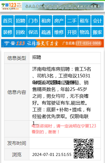 济南电缆库房招聘:普工5名、司机3名,工资电议15031941667仅限电话联系。