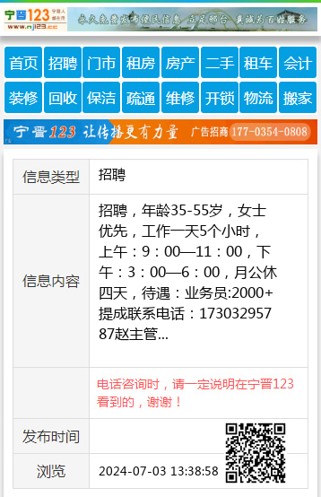 招聘,年龄35-55岁,女士优先,工作一天5个小时,上午:9:00—11:00,下午:3:00—6:00,月公休四天,待遇:业务员:2000+提成联系电话:17303295787赵主管 【电话咨询时,请一定说明在宁晋123看到的,谢谢!】 |